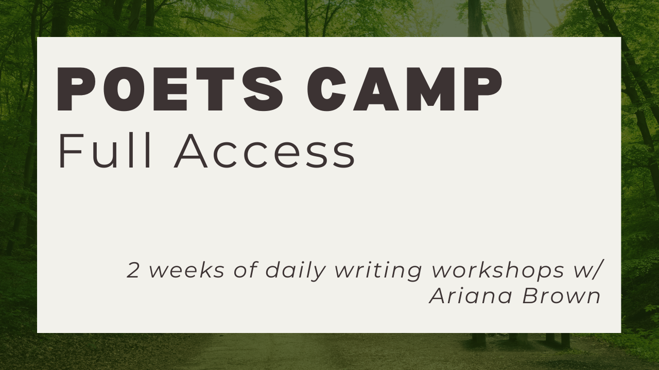 During Poets Camp, we'll meet daily for a two-hour generative poetry writing workshop on a theme I've curated for the day. While we are here to write new poems, our focus is on the relational aspect of tackling this feat together. We'll have a lively chat and spend two-thirds of our time each day checking in with one another and hearing each other read back the drafts we've just written. This is not about clout, publishing, or other external measures of literary success. We are here to remember how to use writing as a tool for discovery, play, fun, and connection.