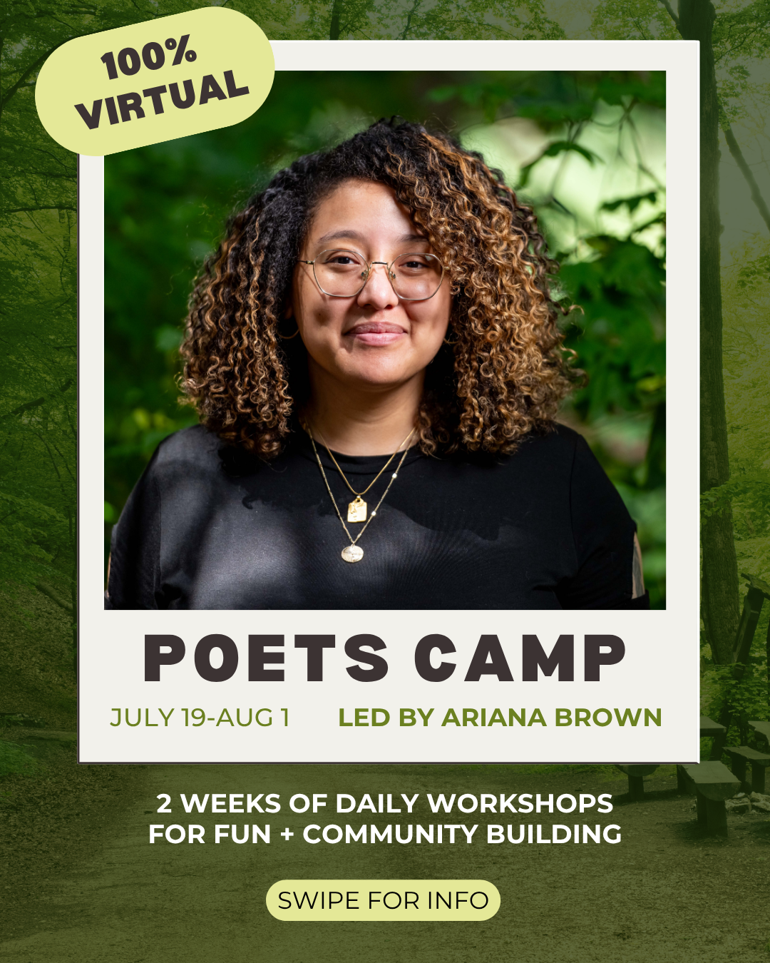 *Backup Workshop Dates: If for any reason Ariana encounters major technical difficulties or emergencies that severely interrupt the Poets Camp workshops, please know that any cancelled workshops will be rescheduled for the week of Aug 9- 15.